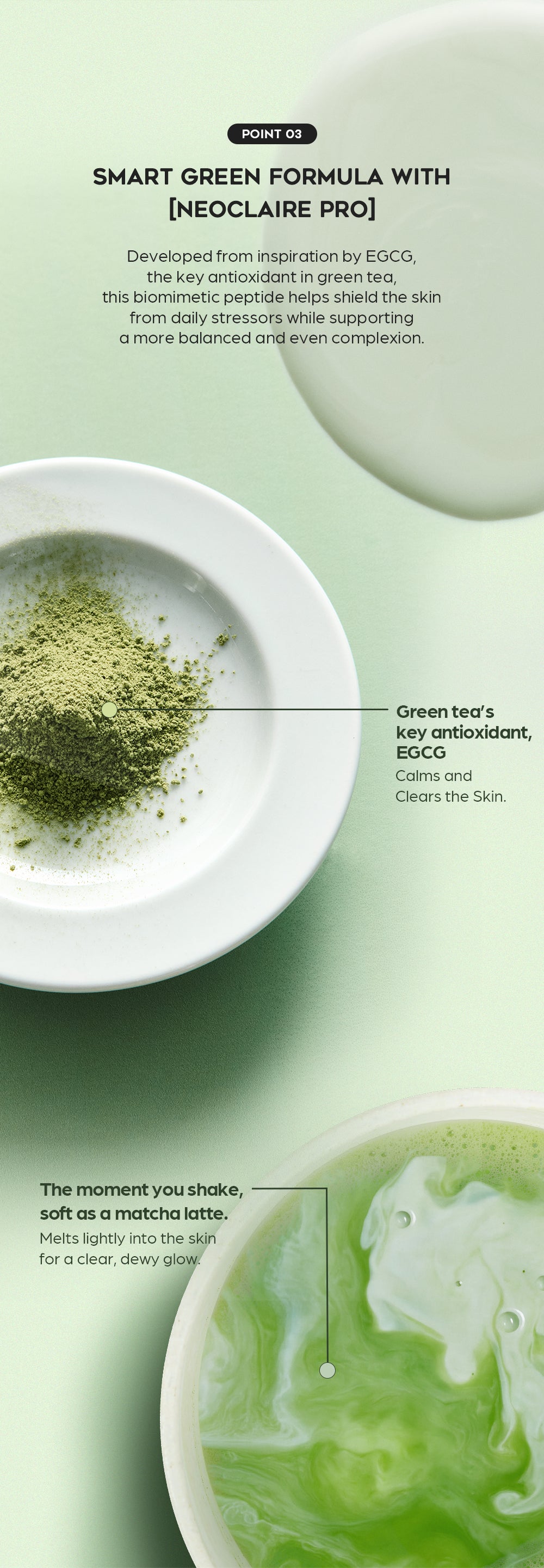 This dual-layer, shake-to-activate formula blends Hadong matcha and Neoclaire Pro™ peptide to deeply hydrate, brighten, and strengthen the skin barrier. Its silky, matcha-latte texture absorbs effortlessly, leaving skin fresh, balanced, and glowing—never sticky. Suitable for all skin types.
